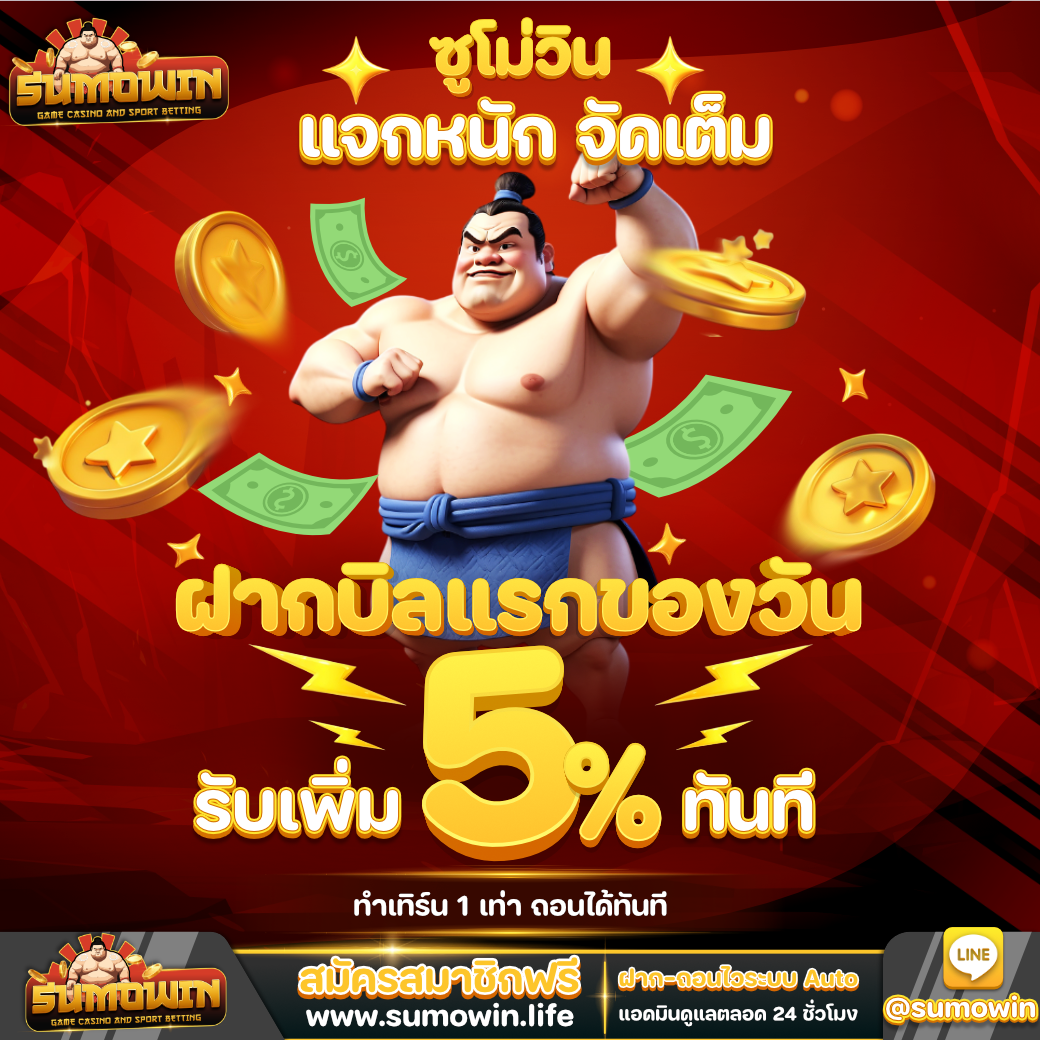 เมื่อท่านฝากเงินกับ Sumowin บิลแรกของวัน ท่านจะได้รับ เพิ่มทันที 5% สูงสุด 10,000 บาท 🎊 ถอนได้สูงสุด 50 เท่าของยอดฝาก